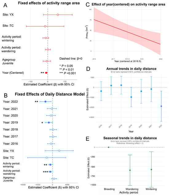 Results from the mixed-effects models analyzing movement patterns. (A) Fixed effects estimates for activity range (95% area); (B) Fixed effects estimates for daily movement distance. In (A,B), dashed lines indicate null effects (β = 0) along with 95% confidence intervals; (C) Annual trends in activity range (95% area); (D) Seasonal variation; and (E) annual trends in daily movement distance.