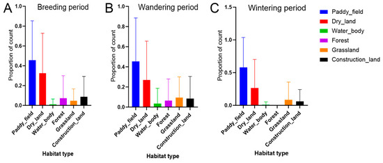 Distribution patterns of foraging sites across various habitat types by record count in (A) breeding period; (B) wandering period; and (C) wintering period.