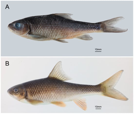 - Shan, X.H.; Lin, R.D.; Yue, P.Q.; Chu, X.L. Barbinae. In Fauna Sinica (Osteichthyes: Cypriniformes III); Yue, P.Q., Ed.; Science Press: Beijing, China, 2000; pp. 126–147. (In Chinese) [Google Scholar]