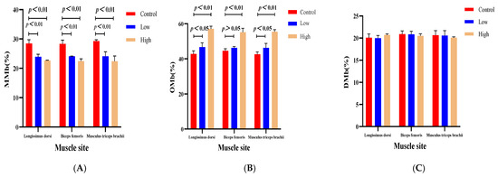 The impact of L-carnitine intervention on myoglobin metabolism in three muscle types of sheep (Longissimus dorsi, biceps femoris, musculus triceps brachii). Note: Panel (A) compares the metmyoglobin (MMb) proportions; Panel (B) analyzes the oxymyoglobin (OMb) proportions; and Panel (C) presents deoxymyoglobin (DMb) proportions. Each subfigure includes the control group, low-dose group, and high-dose group, providing a comprehensive display of the varied effects of L-carnitine supplementation.
