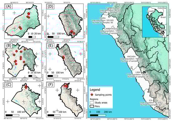 Geographic localization of sampled goat populations across six regions in Peru. Regions: (A) Tumbes, (B) Piura, (C) Lambayeque, (D) Ancash, (E) Lima, (F) Ica. Population estimates are based on data from the most recent Peruvian agricultural census [17].