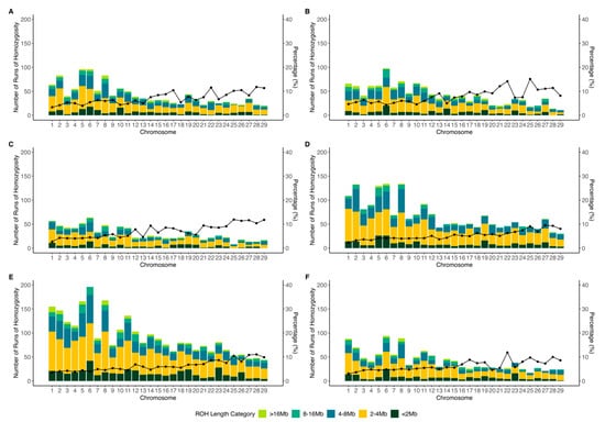 Distribution of runs of homozygosity (ROHs) across chromosomes in Peruvian Creole goats for studied groups: (A) Ancash; (B) Ica; (C) Lambayeque; (D) Lima; (E) Piura; (F) Tumbes.
