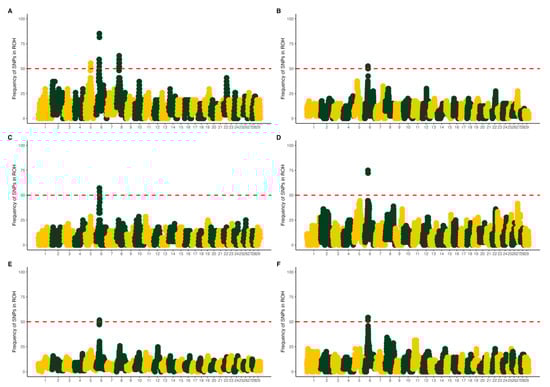 Figure 4 shows six Manhattan plots (A–F) depicting the frequency of SNPs within ROHs across chromosomes. Notably, chromosome 6 exhibited peaks in SNP density for all PCG populations, suggesting that the genomic region was under selection pressure in all populations. Table 1 shows the details of runs of homozygosity hotspots detected in chromosome 6.