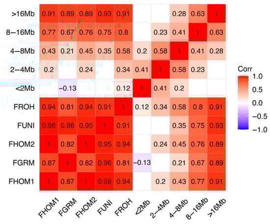 Larger ROH segments, particularly those greater than 16 Mb, exhibited higher correlation (p < 0.05) with inbreeding estimates, suggesting that longer homozygous segments are more strongly associated with inbreeding levels as shown in the other metrics. In contrast, smaller ROH segments (<2 Mb to 4–8 Mb) exhibit lower correlations.