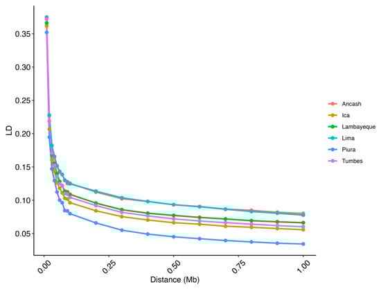 At short distances (0.01 Mb), the average LD values were ~0.37 across all populations. As the distance increases, LD values decrease rapidly, with an average of ~0.11 at 0.1 Mb and stabilizing at around 0.08–0.06 beyond 0.25 Mb. Notably, the Piura population shows the lowest LD values across larger distances, reaching 0.03 at 1 Mb. In contrast, a higher LD value at longer distances was observed for the other populations, with values ranging from 0.06 to 0.08 at 1 Mb (Figure 6).