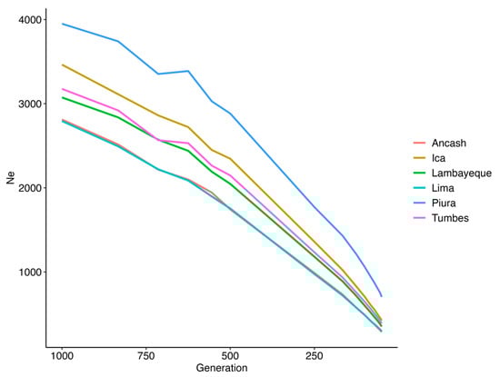 Ancash (Ne = 286) and Lima (Ne = 296) exhibit the lowest recent Ne values among the PCG populations. While these values do not currently indicate a risk of genetic erosion, they highlight the importance of establishing monitoring indicators for inbreeding and maintaining genetic diversity. Tumbes (Ne = 389) and Lambayeque (Ne = 352) show moderately higher Ne values, which remain above thresholds typically associated with genetic risk (e.g., Ne < 150), but still merit continued observation. In contrast, Piura (Ne = 703) and Ica (Ne = 423) maintain relatively higher effective population sizes, indicating more stable breeding populations.