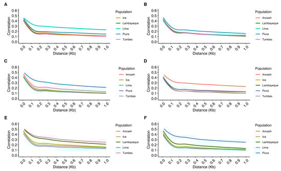 Consistency of the gametic phase in Peruvian Creole goat populations. Each panel (A–F) shows the decay of correlation in the gametic phase between the focal population and the others: (A) Ancash; (B) Ica; (C) Lambayeque; (D) Lima; (E) Piura; (F) Tumbes.