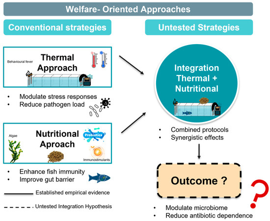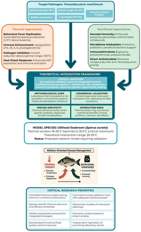 This review adopts a critical framework that distinguishes between empirically validated strategies and theoretical integration concepts (Figure 1). Individual thermal interventions have been demonstrated to be effective in controlled laboratory studies across multiple fish species, with behavioural fever responses documented in zebrafish [21], Atlantic salmon [22], and Nile tilapia [23]. Similarly, nutritional interventions using specific functional feed additives have shown measurable immune enhancement and pathogen resistance in controlled trials [24,25,26]. However, the integration of thermal and nutritional strategies represents an untested hypothesis, lacking empirical validation. No published studies have investigated combined thermal–nutritional protocols against T. maritimum. This integration concept should be, therefore, understood as a research framework requiring rigorous testing rather than an established management approach.
