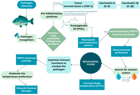 To facilitate recovery from an infection, endotherms express physiological fever, while ectotherms, such as fish, respond behaviourally by moving temporarily to places with higher water temperatures [96]. When fish quickly start seeking out warmer water after sensing an infection, this response is known as “behavioural fever”. Fish exhibiting behavioural fever responses to pathogen challenge involve the active selection of warmer temperatures, typically 2–5 °C above baseline, which enhance immune function through accelerated cellular processes and direct pathogen suppression [21,71]. The tendency of fish to seek out warmer water when ill is not only of scientific interest but also holds practical significance for aquaculture management. If farmed fish had access to a range of water temperatures, they could better manage their health, potentially speeding up recovery and reducing the need for medications. This adaptive response is known to operate through conserved molecular pathways involving pro-inflammatory cytokines, including tumour necrosis factor-α, interleukin-6, interleukin-1β, and production of prostaglandin E2, which trigger reprogramming of thermosensory systems by downregulating TRPV4 channel expression (Figure 2) [22].
