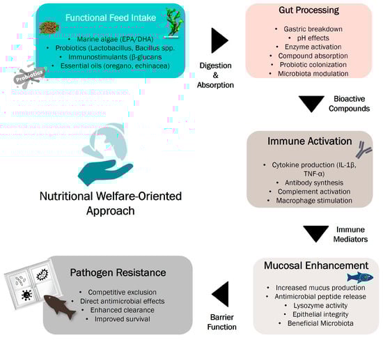 Optimal feeding protocols and balanced nutrition are fundamental to sustainable aquaculture, as dietary deficiencies not only impair growth and reproduction but also compromise immune function and resistance to stress and disease [117,118,119]. Mucosal tissues (skin, gills, and the gastrointestinal tract) serve as the first line of immune defence, and their integrity is closely tied to nutritional status [120]. Strengthening mucosal immunity may, therefore, offer a preventive strategy against tenacibaculosis and reinforce overall fish health [69]. These surfaces present epithelial cells that secrete antimicrobial molecules like lysozyme, which help eliminate invading pathogens. If this barrier is affected, additional innate responses are triggered, such as cytokine production and phagocytic activity by macrophages and neutrophils [120]. The gut also plays a central role in immune defence through its resident microbiota. A balanced microbial community supports digestion, modulates mucosal tolerance, and enhances resistance to infections [121]. In contrast, microbial imbalance (dysbiosis) can increase vulnerability to pathogens [122]. Figure 3 summarises the pathway from functional feed intake to pathogen resistance with the biological responses associated with undergoing these processes. Interestingly, microbiota diversity is influenced by water temperature, with warm-water species generally showing greater microbial richness [122]. To maintain mucosal immunity and promote beneficial gut microbiota, functional feed additives—such as prebiotics, probiotics, and phytogenics—have been increasingly used in aquaculture [123]. For example, Lactococcus lactis subsp. lactis SL242 improved interleukin expression and microbiota balance in gilthead seabream [124], while Bacillus subtilis AB1 enhanced innate immune parameters and pathogen resistance in rainbow trout [125]. Although we have highlighted the above examples of nutritional and microbial interventions, a comprehensive examination of each additive is beyond the scope of this review.