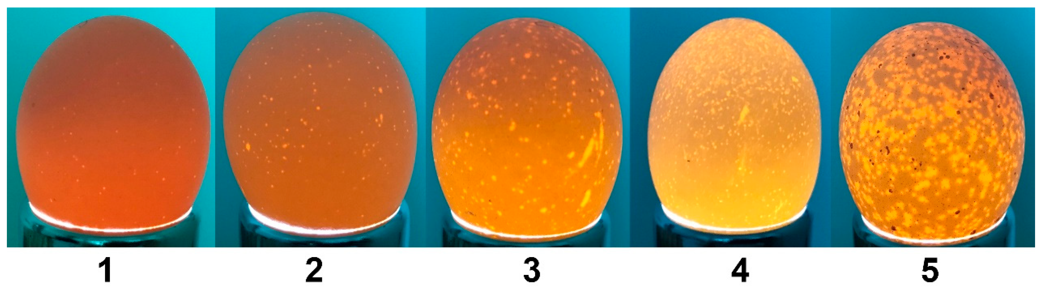 - Xuan, L.; Zheng, J. Translucent eggs of laying hens: A review. Poult. Sci. 2024, 103, 103983. [Google Scholar] [CrossRef] [PubMed]