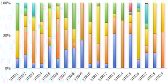 The genetic diversity of the YFPs in Poyang Lake was assessed using the developed microsatellite molecular markers (Supplementary Table S4). A total of 84 alleles (Na) were detected across 19 loci, with the number of alleles per locus ranging from 2 to 6 and an average of 4.42 (Figure 1). Observed heterozygosity (Ho) ranged from 0.44 to 0.84, with a mean value of 0.634; expected heterozygosity (He) ranged from 0.432 to 0.777, with a mean value of 0.649. The polymorphic information content (PIC) ranged from 0.370 to 0.732, with a mean value of 0.577 (Table 2). Except for STR09, STR14, and STR16, the remaining 16 loci (84%) exhibited high polymorphism, as indicated by PIC values greater than 0.5. Figure 2 displays the genotyping results of representative samples. Hardy-Weinberg equilibrium (HWE) analysis indicated that all 16 remaining loci are in HWE (p > 0.05), except for STR07, STR014, and STR16 (p < 0.05). Null allele detection revealed estimated F(null) values ranged from −0.280 to 0.359, with a mean of −0.015. Among these, four loci exhibited relatively high F(null) values (>0.05), suggesting a generally low frequency of null alleles. Furthermore, linkage disequilibrium analysis did not detect significant associations between any pair of loci (p < 0.01).