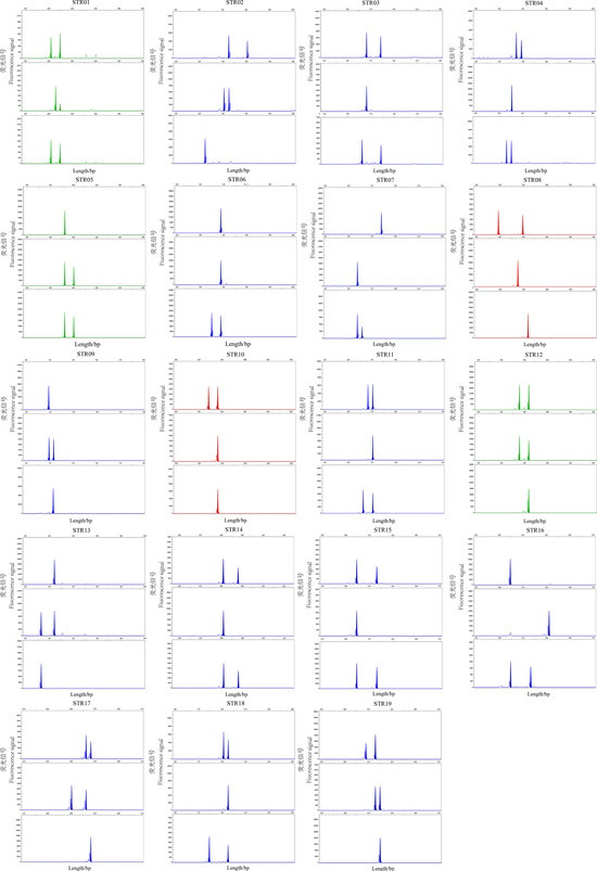 A set of fluorescently labeled primers was synthesized for the 41 four-base microsatellite loci identified during the initial screening phase. Subsequently, using the genomic DNA extracted from 15 Yangtze finless porpoise samples as templates, allele amplification and genotyping were carried out. The polymorphism of these 41 microsatellite loci was assessed using the allele frequency analysis module of Cervus 3.0 software. Finally, 19 highly polymorphic tetranucleotide repeat microsatellite loci, each containing 2 to 5 alleles, were selected (Table 1, the nucleotide sequences of the 19 loci are provided in Appendix A).