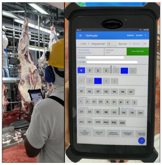 Carcass grading process in beef cattle: a trained technician evaluates hot carcasses for bruises (left), using a digital grading system on a tablet (right).