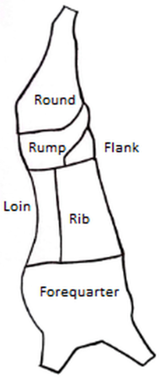 Bruises were identified regardless of their size, color, or number of injuries present. The primal cuts evaluated included round, rump, loin, flank, rib, and forequarter (Figure 2) [14]. For this analysis, a primal cut was recorded as having bruises if at least one bruise was detected on either side or both sides of the cut. Bruises in the primal cuts were analysed on the basis of the following predictive variables: distance travelled by the truck between the origin farm and the destination slaughterhouse, truck class, animal age and sex, and the subcutaneous fat score of the carcasses.