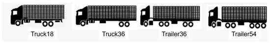 Representative truck classes used for cattle transportation in this study, categorized by type of traction and live load capacity: Truck18 (capacity for 18 animals), Truck36 (capacity for 36 animals), Trailer36 (capacity for 36 animals), and Trailer54 (capacity for 54 animals).