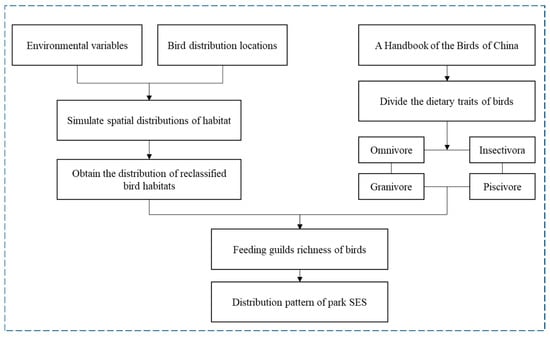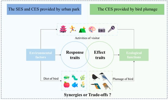 Wildlife and humans coexist in an increasingly urbanized world, where over half of the global population resides in urban areas [1]. Green spaces are essential infrastructure for the sustainability of urban ecosystems, delivering a variety of ecosystem services (ES), including cultural ecosystem services (CES), regulating ecosystem services (RES), and supporting ecosystem services (SES). Regulating services are the benefits obtained from the regulation of ecosystem processes; cultural services are the nonmaterial benefits people obtain from ecosystems; supporting services are those that are necessary for the production of all other ecosystem services [2]. Numerous studies have shown that the CES provided by urban parks contribute significantly to human health and well-being. These spaces offer opportunities for locals and visitors to connect with nature, engage in recreation, and enjoy leisure activities [3,4]. Additionally, urban parks are crucial habitats for birds, as they provide a variety of habitats for breeding, foraging, and roosting, which is reflected in species and functional diversity. Birds also offer a range of ecosystem services, including provisioning, regulating, supporting, and cultural services [5]. The most immediately perceived of these is the cultural service, often associated with bird traits, such as plumage color and song, that provide aesthetic and recreational benefits to people. Among these traits, plumage color is one of the most highly appreciated characteristics [6,7]. However, spatial overlap between humans and birds inevitably leads to spatial overlap with natural competition [8]. Visitors may increasingly encroach upon sensitive areas, such as woodlands, natural pools, and lakes, which may severely disturb the habitats of birds in urban parks [9]. Moreover, as co-users of park resources, birds and humans often have distinct and sometimes conflicting demands, especially for vegetation and water [10]. Consequently, trade-offs may arise between the CES provided by urban parks and the SES utilized by birds, as well as between the CES provided by the parks and those contributed by birds themselves. Thus, understanding the relationships between visitors and birds from an ecosystem services perspective can help mitigate competition arising from spatial overlap, promote bird conservation, and enrich the visitor experience.