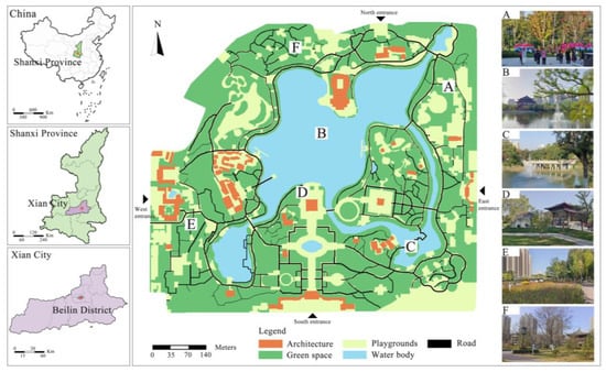 The study area is located in the Beilin District of Xi’an City (34°15′13.32″ N, 108°58′7.32″ E), which experiences a warm-temperate continental monsoon climate with four distinct seasons, including cold winters and hot summers. The average annual temperature ranges from 11.1 to 13.3 °C. The park, which was established in 1958 on the site of the Tang Dynasty’s Xingqing Palace, covers an area of 492,000 m2 (100,000 m2 of which is water) (Xi’an Xingqing Palace Park official website: https://www.xingqinggong.com/ (accessed on 17 July 2025)). It is surrounded by residential neighborhoods, government offices, and educational institutions, including kindergartens, primary and secondary schools, as well as three university campuses. With a diverse array of internal landscapes and a dynamic cultural environment, the park holds significant historical and cultural value for Xi’an City and serves as a popular destination for leisure and recreation for local residents (Figure 2).