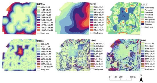 As shown in Figure 3, the SolVES and MaxEnt models require the integration of various environmental data, in addition to the analysis of social value points and regional boundaries, to fully describe the environmental characteristics of the study area. To describe the environmental characteristics of the study area for SolVES and MaxEnt modeling, while working within equipment constraints, this study has made every effort to select the maximum number of feasible environmental factors for comprehensive analysis. We collected data on land use and land cover (LULC), visible band difference vegetation index (VDVI), distance to road (DTR), distance to water (DTW), digital surface model (DSM), and noise level (NL) as the environmental variables for the study area. The spatial resolution of the data for each of these environmental indices was five meters. The data sources and processing procedures are summarized in Table 2. The boundary of the study area was captured via aerial photography using a DJI Air 2S drone DJI Air 2S drone (SZ DJI Innovation Technology Co., Ltd., Shenzhen, Guangdong, China) (flight altitude: 200 m, camera angle: 90°), and the images were subsequently stitched using Pix4D 4.5.6 software to generate a planar map of the park. For the noise survey, three rounds of measurements were conducted. Along each avian survey transect, 7–8 sampling points were evenly distributed at 50-m intervals. Noise levels were measured at each point using a sound level meter during the same time period. Measurements were taken by holding the instrument stationary at 1.5 m above the ground, with the microphone oriented vertically downward (covered by a windscreen). The maximum noise level (NL) and GPS coordinates were recorded for each sampling point.