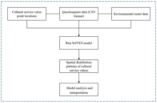 SolVES is a GIS application developed by the U.S. Geological Survey (USGS) to assess the perceived social values, or CES, such as aesthetics and recreation, for different stakeholder groups [24]. Our study utilized the ecosystem services social-values module and the value mapping module of the SolVES model (Figure 4). Table 2 presents the variables used in the SolVES model. The model generates value index maps for different park CES, with the index ranging from 1 to 10, where a higher index value indicates greater value as perceived by visitors.
