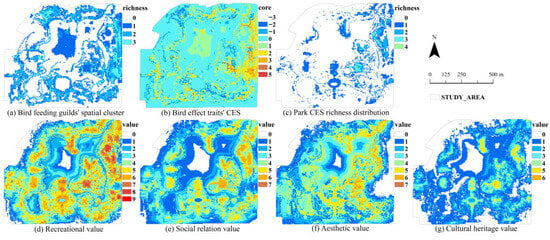 The spatial cluster results show that most of the hard-paved plazas in the eastern part of the park were rich in all types of CES. In contrast, other areas had relatively lower levels of CES (Figure 6c). Specifically, areas with a recreational value above 6 were evenly distributed throughout the park, while areas with values greater than 8 were concentrated on the eastern side (Figure 6d). The spatial pattern of social relationship value closely resembled that of recreational value. However, areas with the highest value index were generally lower than those for recreational value (Figure 6e). Areas with an aesthetic value greater than 6 were primarily located in the water bodies surrounding the island, as well as on the island itself (Figure 6f). The architectural landscape had high historical value, with the highest value index of 6 (Figure 6g).