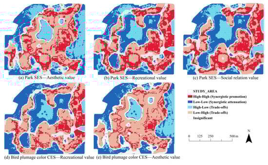 Bivariate spatial autocorrelation indicates that bird plumage color CES related to recreational value had a positive correlation (Moran’s I = −0.123), while bird plumage color CES related to aesthetic value exhibited a negative correlation (Moran’s I = −0.173). The remaining aspects showed little correlation. According to Lisa’s diagrams, the spatial pattern of trade-offs/synergies for bird plumage color CES related to recreational value reveals that the proportion of spatial synergies was greater than the spatial trade-offs (Figure 7d). The synergistic promotion areas appeared along main roads with vegetation cover. The synergistic attenuation areas were similar to other ES elements, appearing at the park’s boundary and within the waterbody. The trade-offs were found in the impervious surface areas and the waterbody center. In addition, the spatial pattern and space distribution reveals that the spatial trade-offs were to be a priority (Figure 7e). Unlike the trade-off between bird plumage color CES and aesthetic value coverage on a large scale, synergistic promotion is reflected in the small range of spatially fragmented areas.