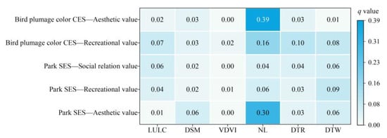 The results from the geodetector analysis indicate that NL (q = 0.30) has a strong impact on the relationships between park SES and aesthetic value (Figure 8). The trade-offs/synergies between park SES and recreational value, as well as park SES and social relationship value, are weakly influenced by individual factors.