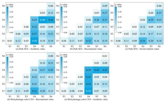 Geographic detectors are employed to examine the interaction effects of explanatory variables and potential influencing factors [29]. We used this model to assess the strength of each factor in Table 2 in influencing the trade-offs and synergies between park SES and park CES, as well as between bird plumage color CES and park CES. A stronger correlation between the explanatory variable (X) and the explained variable (Y) occurs when their geographic distributions are similar. The degree to which X explains Y is expressed as the deterministic power factor q, which quantifies the similarity between the spatial distributions of X and Y [28]. The following formulas were used to determine the q values: