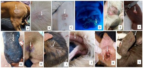 Figure 1. Clinical presentations of dermatomycosis in dogs. Arrow in each photo points to the lesion (A): Circular area of alopecia and scaling on the thigh of a 7-month-old Pitbull dog infected with M. canis. (B): Erythema, circular area of alopecia, and scaling on the abdomen of an 11-year-old Griffon infected with M. canis. (C): Multiple circular lesions on the back of a 6-month-old Griffon infected with M. canis. (D): Apple green fluorescence glow of affected hair shafts in a pug dog infected with M. canis. (E): Circular areas of alopecia with erythema, crusting, and scaling on the paw of a Husky infected with Nannizzia gypsea. (F): Erythema and alopecia on the rump of a 6-month-old Pitbull infected with T. mentagrophytes. (G): Multiple circular lesions with alopecia, crusting, and scaling of the entire back of a Rottweiler with T. mentagrophytes. (H): Crusting and hair loss behind the shoulder of a 6-month-old Mastiff infected with T. verrucosum. (I): Crusting and scaling of the lumbosacral area of an 8-month-old local breed with T. indotineae. (J): Erythema, thickening, lichenification, and hair loss of the tail of a Golden Retriever dog infected with Malassezia pachydermatis. (K): Otitis externa, hair loss, and erythema of the ear of a Golden Retriever dog infected with M. pachydermatis. (L): Ear tip fissuring with white deposits on the hair of the ear of a 7-month-old Pitbull dog infected with Trichosporon asahii.