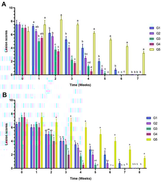 Figure 3. Mean score of dogs (A) and cats (B) suffering from ringworm and treated with different regimes. G1 animals were topically treated with clotrimazole, G2 were topically treated with clotrimazole and 1% itraconazole oral suspension, G3 received clotrimazole, itraconazole, and supportive treatment with multivitamins and minerals, and G4 received clotrimazole, itraconazole, supportive treatment, and vacderm vaccine. Animals in G5 were infected and untreated. Results are expressed as mean± SEM (standard error of the mean). a–d Means with various superscript letters within the same column indicate significant difference at p < 0.05.