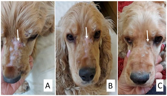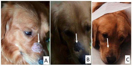 Figure 5. Treatment of a four-year-old Golden Retriever dog with clotrimazole, itraconazole, supportive treatment, and vacderm vaccine. The arrow in each photo points to the lesion. (A) Circular area of alopecia and scales on muzzle, (B) 2 weeks post-treatment, and (C) 4 weeks post-treatment.