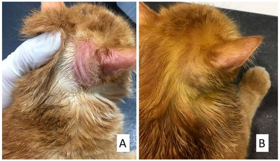 Figure 6. Treatment of a 5-year-old Persian female cat with clotrimazole, itraconazole, supportive treatment, and vacderm vaccine. (A) Alopecia and erythema on the ear and neck, (B) 4 weeks post-treatment.