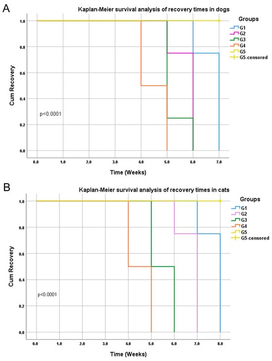 Figure 7. Kaplan–Meier survival analysis of recovery times in the different treatment regimens for infected dogs (A) and cats (B). G1 animals were topically treated with clotrimazole, G2 was topically treated with clotrimazole and 1% itraconazole oral suspension, G3 received clotrimazole, itraconazole, and supportive treatment with multivitamins and minerals, and G4 received clotrimazole, itraconazole, supportive treatment, and vacderm vaccine. Animals in G5 were infected and untreated. Highly significant differences were detected between the recovery time in the treated groups (p < 0.0001). Censored referred to animals in the control group (G5) that did not reach full recovery at the end of the observation period.
