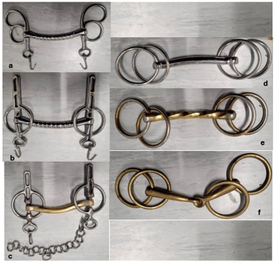 Different bit configurations: (a) Butterfly Liverpool in steel; (b) Liverpool bit in steel; (c) Liverpool bit in copper–steel with the curb chain used for (a–c); (d) Loose Ring Snaffle with 4 rings in steel; (e) Loose Ring Snaffle with 4 rings in copper–steel; and (f) Loose Ring Snaffle with 4 rings in copper. Photo by the authors.