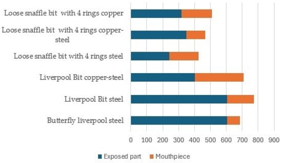 In Ireland, most bits are manufactured from stainless steel, with copper as the second most common material; stainless steel mouthpieces are considerably harder than copper [9]. Depending on the country, other materials such as titanium, plastic, and rubber bits are also commonly used. Mouthpiece material has shown no difference in the horse’s salivary pH through oxidation when using titanium and stainless steel bits [10]; excessive salivation has been investigated to be a behaviour not caused by bit-induced pain but rather by other physiological effects such as a reflex response to an oral foreign body [11]. Yet no published analyses exist examining the effects of different mouthpiece materials on equine well-being.