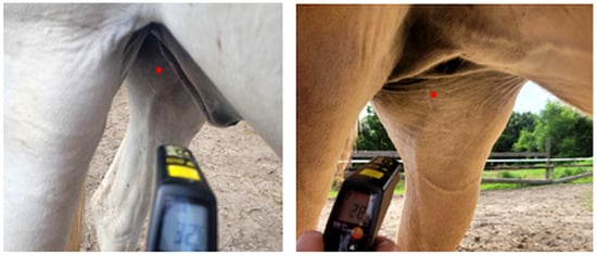 The surface temperature of the inner thigh (STT) was measured, as rectal body temperature could not be obtained in this observational study. Two non-contact IRT thermometers were used in the study. The Laserliner ThermoSpotPocket (Umabrex, Arnsberg, Germany) (used January–April) was replaced with the Testo 830-T1(Testo Austria, Vienna, Austria) (used April–November) because the former could not save data, necessitating simultaneous manual documentation. All measurements followed a standardized protocol: they were taken at a right angle to the horse’s long axis, approximately one metre from the horse’s side, aiming at a point a hand’s width below the udder (in mares) or prepuce (in geldings) at the location of the femoral canal. This location was chosen to minimize external radiation interference and because the femoral vein was clearly visible (Figure 5).
