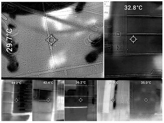 Grayscale set of a thermal image of the ground temperature, top left, showing the ground beneath the horse clearly identified by all four distal limbs. Top right—thermal image of a façade. At the bottom there is a panorama series of images of building surfaces in the sun and in the shade. Temperature values in the images refer to the temperature of the circle in the centre of the image. Photo by the authors.