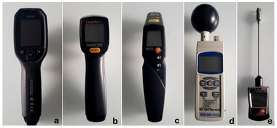 The measurement devices used in the present study. (a) FLIR TG165-X MSX (FLIR, Täby, Sweden) Thermal Camera for infrared thermography, (b) Laserliner ThermoSpotPocket thermometer (Umabrex, Arnsberg, Germany), (used for infrared thermography, (c) Testo: 830-T1 thermometer(Testo Austria, Vienna, Austria) used for infrared thermography, (d) heat index WBGT metre PCE-WB 20 SD (PCE, Meschede, Germany) used for meteorological measurements, and (e) surface thermometer Testo 905-T2 (Testo Austria, Vienna, Austria) used for measuring the temperature of the mouthpiece. Photo by the authors.