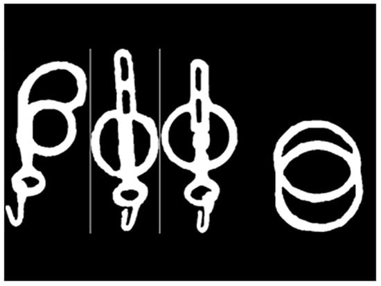 Binary images of the left-sided parts of the bit exposed to sunlight in the different bit configurations. From left to right: Butterfly Liverpool, Liverpool bit steel, Liverpool bit copper–steel, and Loose Ringe Snaffle with 4 rings. Photo by the authors.
