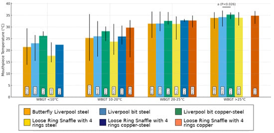 Median values (min–max) of mouthpiece temperatures [°C] of the bit configurations in the groups of WBGTs. Four groups of WBGTs (<10°, 10–20°, 20–25°, and >25°) were formed to document differences between bit configurations using Friedman’s test, followed by Conover’s post hoc test. Post hoc significance values were adjusted using the Bonferroni correction for multiple tests. Superscript a indicates a significant difference between the Liverpool bit steel and the Liverpool bit copper–steel in the category WBGT > 25 °C (p < 0.026).
