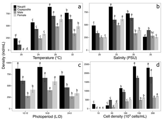 Density of Oithona nana by stage at the end of the experiment (a) Temperature, (b) salinity, (c) Photoperiod and (d) Isochrysis galbana cell density. The letters above each bar indicate statistically significant differences between treatments.