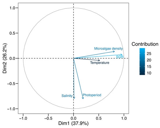 The principal component analysis (PCA) conducted on the experimental cultivation parameters of O. nana (temperature, salinity, photoperiod, microalgae density, and specific growth rate index, SGR) revealed a notable separation of the influencing factors across the first two PCA dimensions (Dim1: 37.9%, Dim2: 26.2%), together explaining 64.1% of the data variability (Figure 2). The PCA vectors indicated a strong positive association between microalgae density and SGR, suggesting that greater food availability could promote an increase in the growth rate of O. nana.