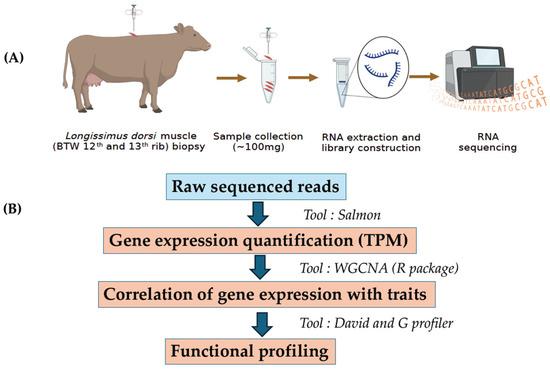 Raw sequencing reads (FASTQ files) were subjected to quality control by FastQC https://www.bioinformatics.babraham.ac.uk/projects/fastqc/ (accessed on 1 August 2022). In brief, FastQC detected contaminants including overrepresented sequences, sequencing adapters, poor quality reads and PCR duplicates. All these contaminants were filtered using Cutadapt 1.4 (Command line: cutadapt -a ADAPTER_FWD -A ADAPTER_REV -o out.1.fastq -p out.2.fastq reads.1.fastq reads.2.fastq) [16,17]. The cow reference transcriptome files (Bos taurus ARS_UCD 1.2) for mapping and quantification were obtained from Ensembl genome browser https://ftp.ensembl.org/pub/release-108/fasta/bos_taurus/cdna/ (accessed on 10 August 2022). The initial step involved indexing the cow reference transcript file using the Salmon index option. (command line: salmon_index -t cow_transcripts.fasta -d decoys.txt -p 12 -i cow_salmon_index). The transcriptome-wide quantification in the form of TPM (transcript per million) on clean reads were performed using salmon v 1.6.0 (command line: salmon quant -i salmon_index -l A -1 Clean_Read_1.fq -2 Clean_Read_2.fq --validateMappings -o salmon_quant -p 12 --seqBias) [17]. The workflow of RNA sequencing and data analyses are shown in Figure 1.