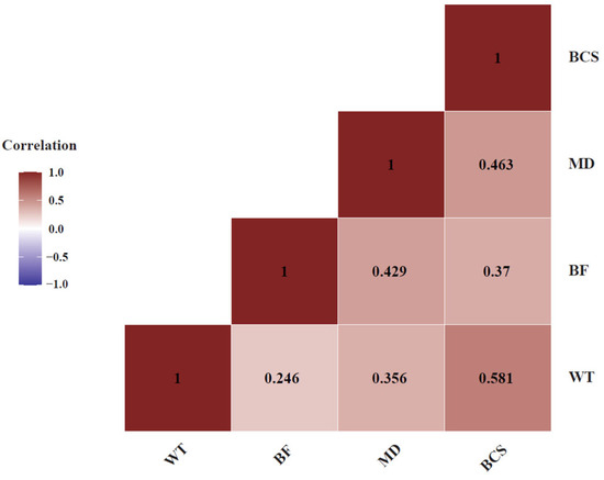We recorded four traits in these cows (Table 1). Covariation between these four traits showed that all four traits are positively correlated with each other as expected. Among these traits, BCS and WT had a correlation of 0.581, whereas MD and BCS were also positively correlated, at 0.463 (Figure 2).