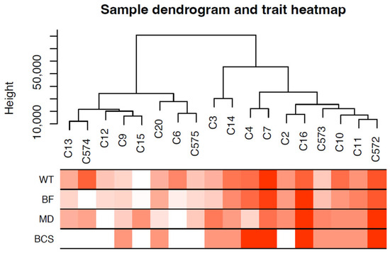Sample dendrogram and trait heatmap. The dendrogram plotted by hierarchical clustering using gene expression of 18 cow samples. The heatmap below the dendrogram indicates trait data. The analysis clearly divided the 18 cows into two groups: light-weight cows (8 cows) and heavyweight cows (10 cows).