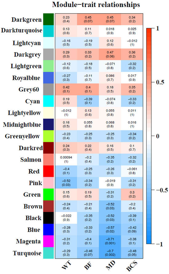 Correlation between modules (group of genes) and traits [body weight (BW), back fat (BF), muscle depth (MD) and body condition score (BCS)]. Module names are displayed on the left, and the correlation coefficients are shown at the top of each row. The p-values for each module are displayed at the bottom of each row within parentheses. The rows are colored based on the correlation of the module with the trait: Red for positive and blue for negative correlation.