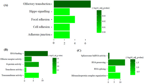 KEGG pathway analysis of the dark-green module showed ‘olfactory transduction’ as the most significant pathway. Gene ontology molecular function and biology process analysis of dark-green showed RNA binding and spliceosome snRNA activity as significantly enriched GO terms (Figure 5). Additionally, KEGG pathway analysis of the magenta module showed hematopoietic cell lineage as the most significant pathway. Gene ontology molecular function and biology process analysis of magenta showed protein binding and immune system process as significantly enriched GO terms (Figure 6).