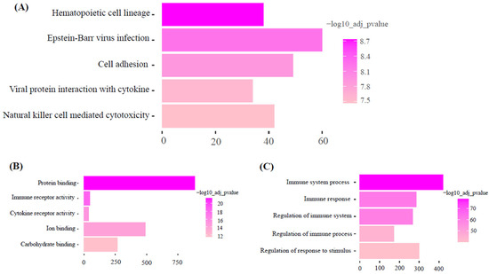 Functional enrichment analysis of Magenta module. (Top five pathways or terms shown). (A): KEGG: Metabolic Pathways. (B): GO: Molecular function. (C): GO: Biological process.