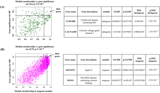 For the dark-green module, CCDC88C (Coiled-coil domain containing 88C) and CACNA2D3 (Calcium voltage-gated channel 3) were identified as hub genes. These genes have gene significance > 0.5 with back fat and module membership >0.9 with dark-green module eigengene. In the magenta module, SEPTIN9 and NONO (Non-POU domain containing octamer binding) genes were defined as hub genes based on their gene significance >0.8 with muscle depth and module membership >0.9 with magenta module eigengene (Figure 7).