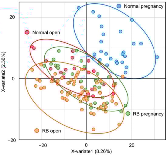The Venn diagram shows that 4121 species were detected in the fecal microbiota of 150 cows, of which 69.4% were common to all four groups (Supplementary Figure S1A). In contrast, some bacteria were found only in one group (Supplementary Figure S1A). The results of the PCA showed no clear differences among the four groups (Supplementary Figure S1B). However, the results of PLS-DA analysis showed differences in classification among the four groups (Figure 1). In particular, while the classifications between the groups of Normal pregnancy and RB open were completely different, there was a large overlap between the Normal open and RB pregnancy groups (Figure 1).